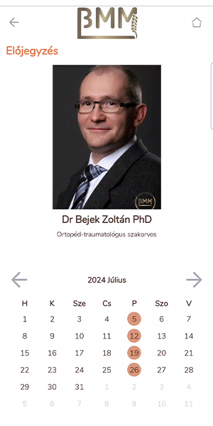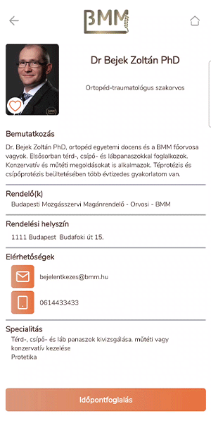 A BMM időpontfoglaló applikációja az ortopédia és reumatológia területeinek specialistáihoz való könnyed időpontfoglalást szolgálja. A felületen belül rugalmasan kezelheti időpontjait és elérheti leleteit. Az applikáció segítségével Ön mindig kézben tarthatja egészségügyi dokumentációját, kórelőzményét.